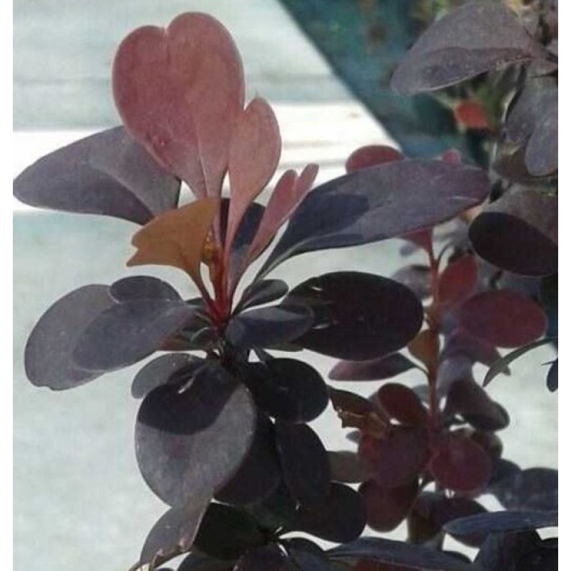Листья темно-красного цвета, относительно крупные, густо покрывают ветви.