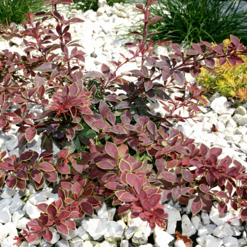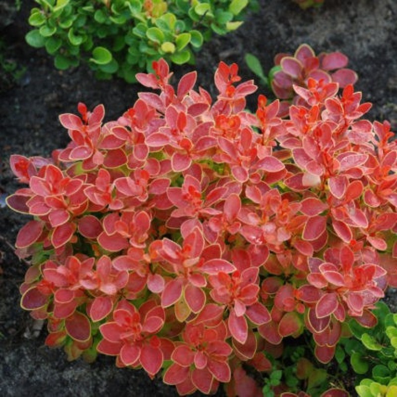 Барбарис Тунберга Коронита (Coronita). Этот приземистый красивый кустарник вырастает в диапазоне от 50 см до 1,5 м.