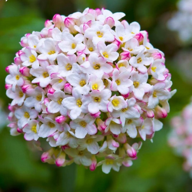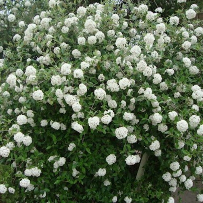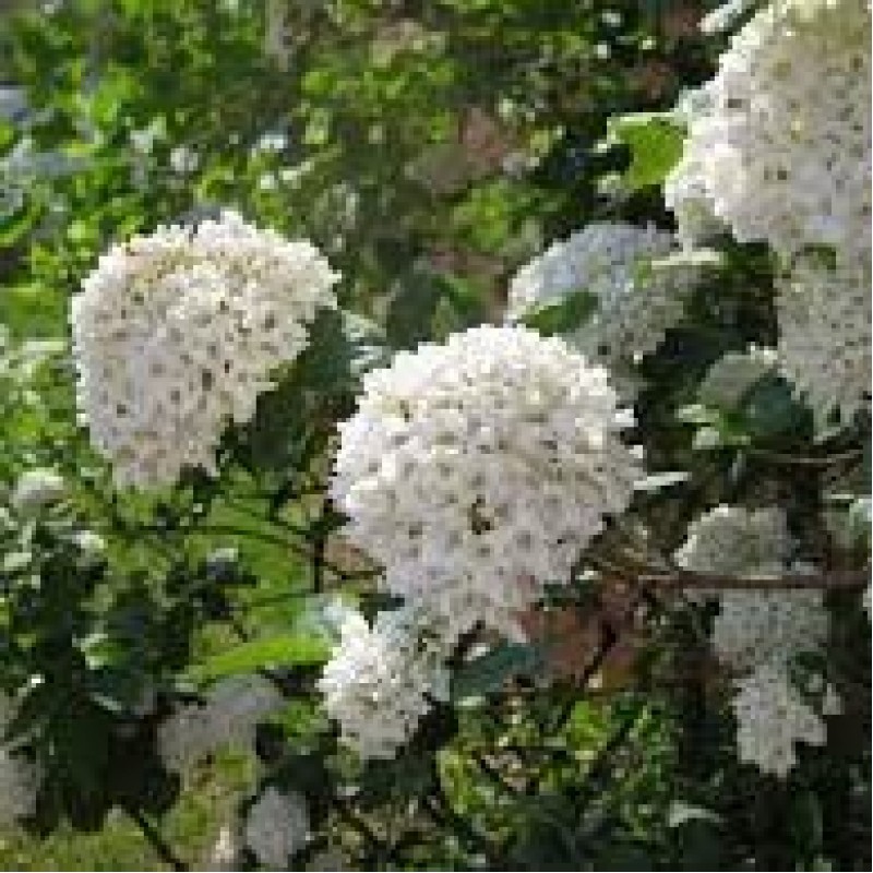 Весной куст покрывается крупными белыми или кремово-белыми цветками, собранными в шаровидные соцветия диаметром до 10 см.