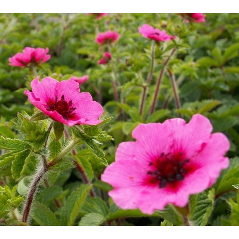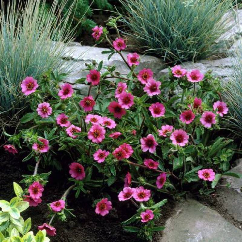 Лапчатка непальская Мисс Вильмонт Сорт, обильно цветущий практически весь сезон вишнево-розовыми, с темным глазком, цветками.