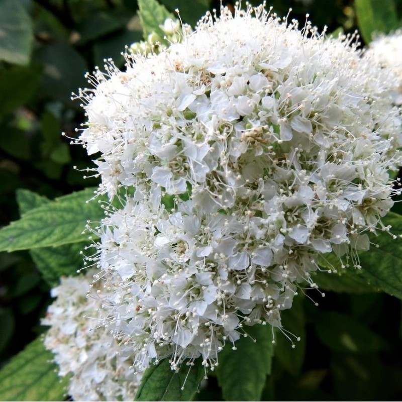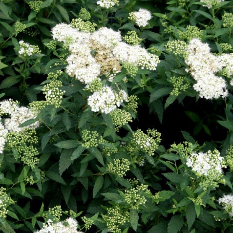 Весной и в начале лета кустарник покрывается обильным цветением, состоящим из маленьких белых цветов, собранных в соцветия.
