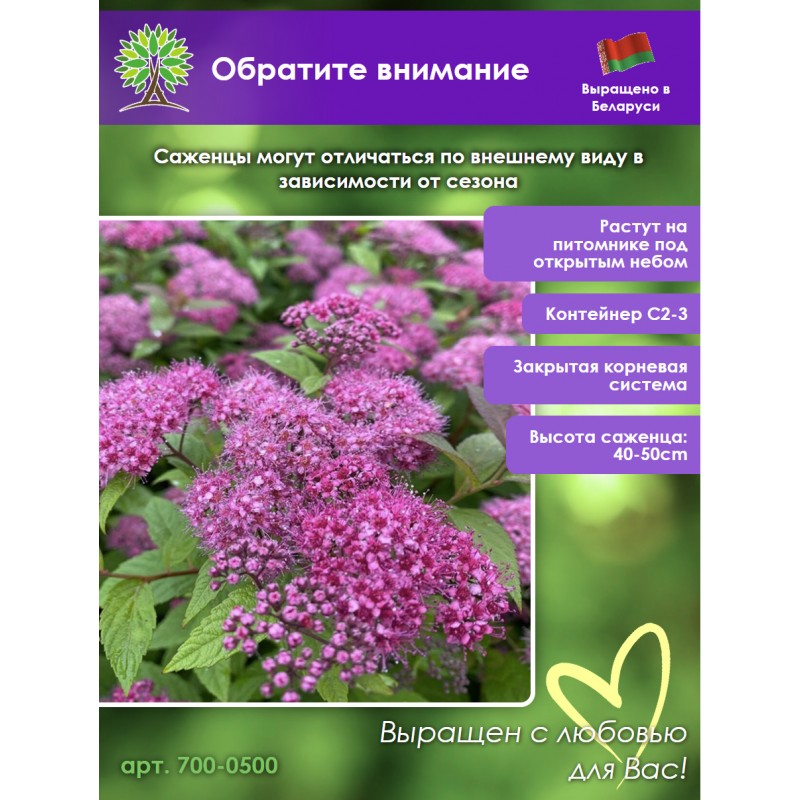 - Важное описание:Особенности ухода: Неприхотливая спирея, которая нуждается в минимальном уходе. Полив необходим только в засушливые периоды. Обрезка проводится весной для стимуляции роста и сохранения компактной формы куста