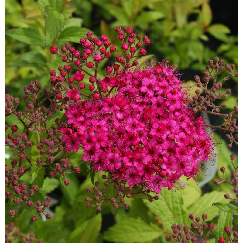 Спирея японская Кантри Ред (Spiraea japonica Country Red) - невысокий компактный кустарник до 0,8м высотой и диаметром с вертикально растущими побегами, иногда склоняющиеся.