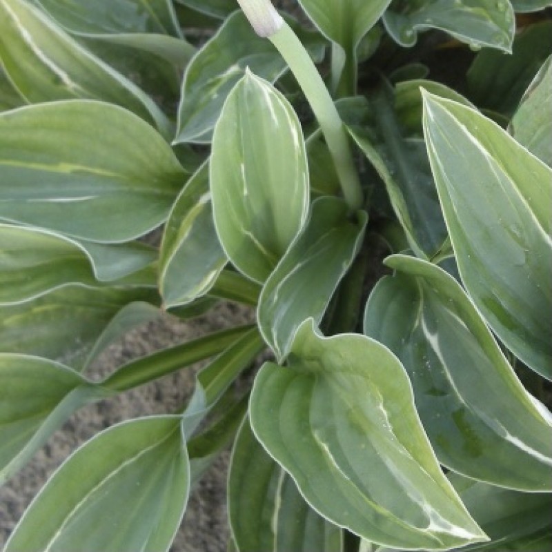 Зеленоватые с белым полосатым центром, с бледно-голубовато-зеленой каймой листья.
