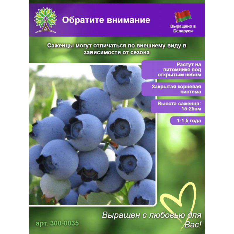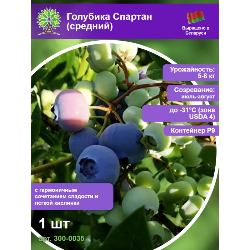 35 | Голубика Спартан (средний) | Средний срок созревания, сорт с ярким вкусом и высокой урожайностью. Хорошо переносит заморозки. | Освещенность: