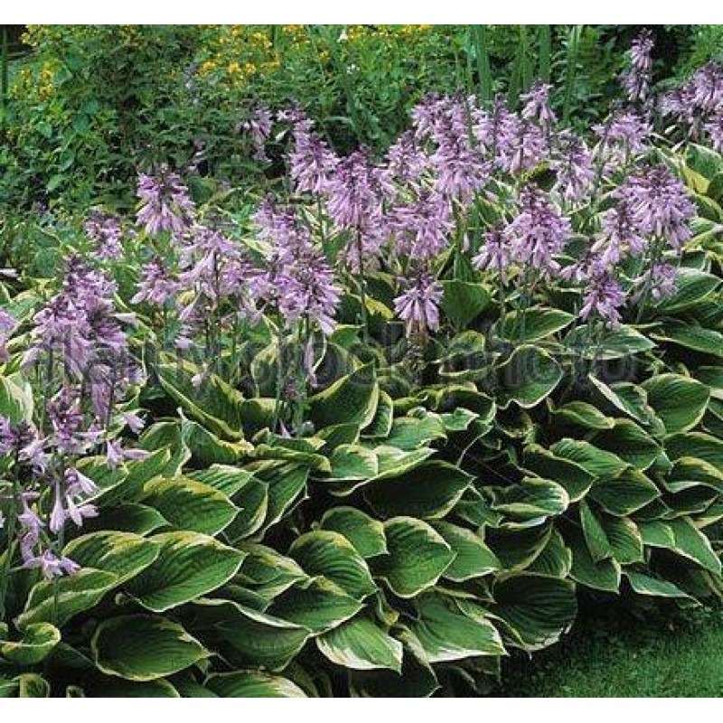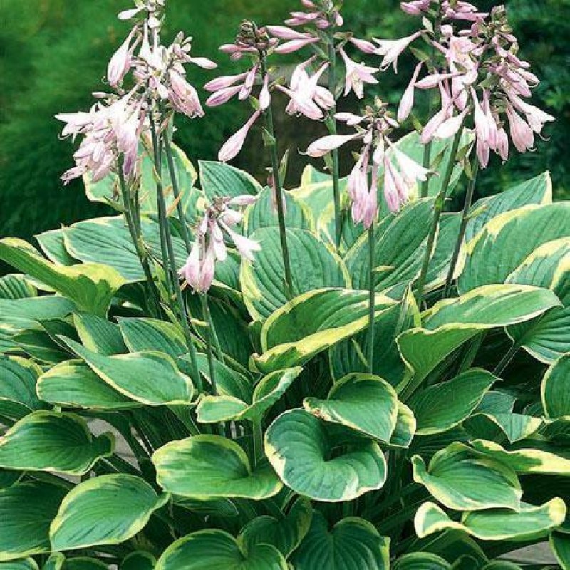 Хоста форчуна "Ауреомаргината" «Aureomarginata» - Замечательный неприхотливый сорт. Этот сорт хосты растет прекрасо на полном солнце, и в полутени, и в тени. Окраска листьев или цветков: цветки – светло-сиреневые, листья овальные с острым кончиком, размер листа 20 x 15 см фактурные, зелёные с сизым оттенком и золотисто-желтым нерегулярным окаймлением, которое к концу сезона становится кремовым. Высота взрослого растения- 55 см.